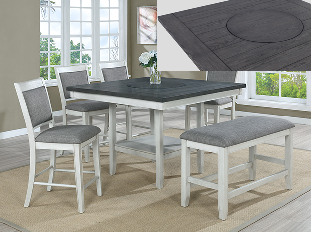 Transform your dining area with this elegant counter height dining set, designed to bring a touch of modern farmhouse charm to your home. The centerpiece table features a stunning dark wood top with built-in turntable that contrasts beautifully with the distressed white base, creating a striking visual appeal. Accompanied by four plushly upholstered chairs and a versatile bench, all in a soft gray fabric, this set ensures comfort and style for every meal. The high-quality construction guarantees durability, while the classic design elements blend seamlessly with contemporary or traditional décor. Perfect for both intimate family dinners and larger gatherings, this set promises to enhance your dining experience with its inviting ambiance and exceptional functionality.