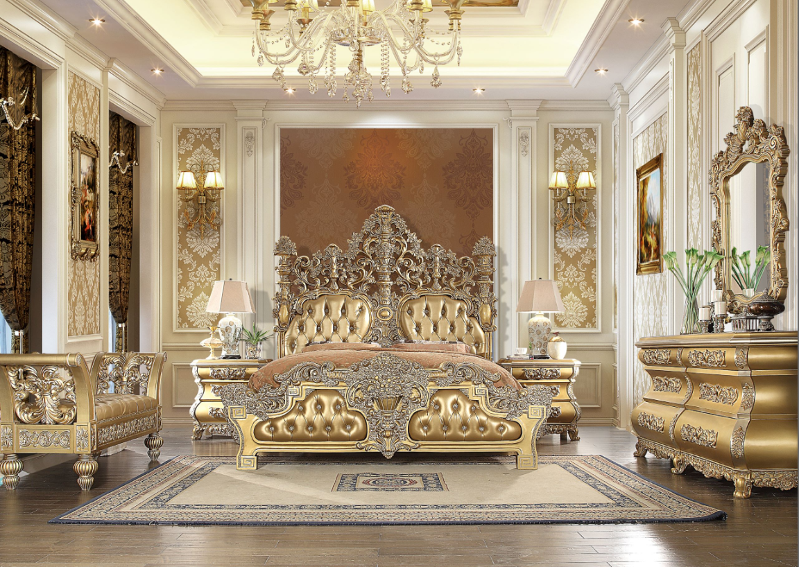 Presenting the Victorian Carved Frame HD-8016 Bed with a Rich Gold Finish Tufted Headboard, creating an ambiance of royalty in your bedroom. Sleeping in this bed offers a plush and luxurious experience, blending style and comfort seamlessly. Every piece in this bedroom set features intricate carvings that highlight the opulence of classic design elements.
