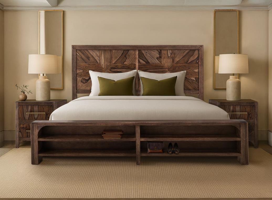 ransform your space with this modern bedroom set. Crafted from engineered teak and sustainable mango wood, this collection combines lasting durability with natural beauty. The rich brown multi-step lacquer finish adds warmth and depth to the furniture. Featuring a functional footboard with storage, this all-solid wood bedroom furniture is ideal for those seeking to blend modern design with practical features.