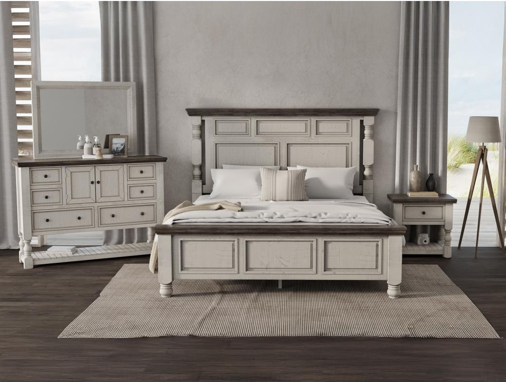 Exuding farmhouse chic with just the right touch of old-world charm, the Stone Collection is meticulously crafted from solid pine wood. The wood is lightly distressed, showcasing a white finish and complemented by weathered gray tops.
