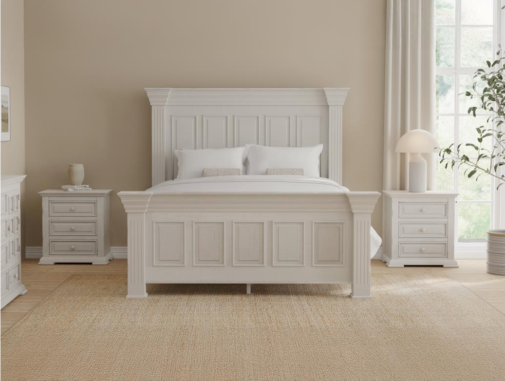 Drawing inspiration from transitional design, the Terra White collection embodies the effortless elegance of its clean, sturdy shapes and the charming rustic grain of solid pine wood. With a tasteful white distressed finish, this collection represents a harmonious fusion of modern and traditional elements, making it a timeless addition to your home.