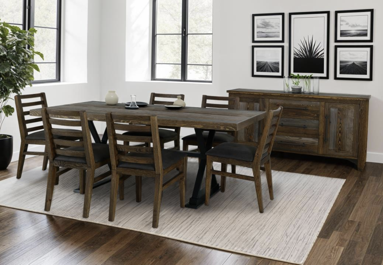 Elevate your dining experience with the Town Dining Collection, a perfect blend of rustic charm and modern elegance. This table features a beautifully crafted pine and poplar wood tabletop with a wire-brushed finish, adding texture and character. The sturdy metal base with a powder-coated matte finish ensures durability. The rustic wooden top and the elegant trestle metal base make this table both functional and stylish. Experience the timeless beauty and exceptional craftsmanship of the Town collection's Dining set and let it become the centerpiece of your dining room.