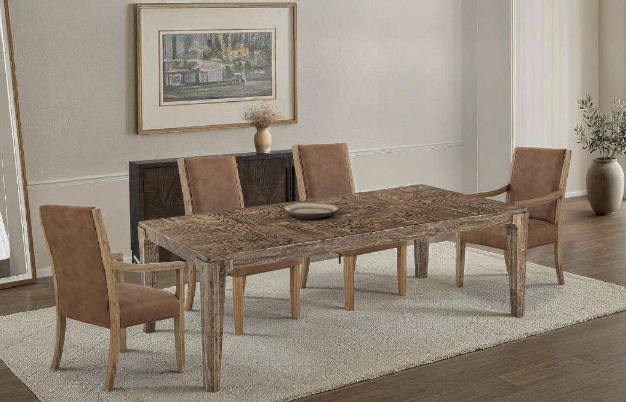 This captivating solid wood dining table adds warmth and elegance to any space. It features a hand-crafted frame made of sustainable mango wood, complemented by a stunning ash engineering wood top that showcases the intricate grain of nature. Constructed using traditional mortise and tenon joinery, this table provides exceptional stability and durability for long-lasting use. Its organic textures and graceful lines combine artisanal craftsmanship with timeless appeal, making it the ideal centerpiece for modern, farmhouse, coastal, transitional, or any other interior design.